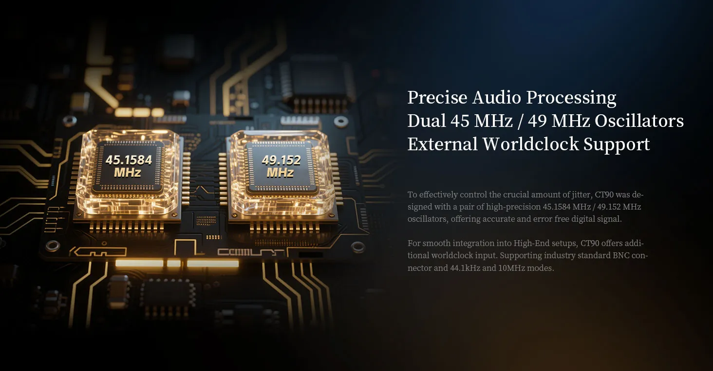 Lo Shanling CT90 utilizza due oscillatori di clock, uno a 45MHz ed uno a 49MHz, per ottimizzare in maniera radicale il fenomeno del jitter e poter così fornire un segnale digitale accuratissimo e con la massima fedeltà in ogni circostanza.